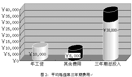 就中國(guó)目前的經(jīng)濟(jì)水平而言,一個(gè)座席人員年收入(包括工資、獎(jiǎng)金、福利等等)大約為¥10,000,而每個(gè)座席人員所配備的軟硬件設(shè)施合計(jì)約為¥5,000;據(jù)專(zhuān)業(yè)機(jī)構(gòu)統(tǒng)計(jì),中國(guó)的座席人員平均穩(wěn)定的工作年限為三年,而在這三年為了保證座席人員能夠準(zhǔn)確、高效的實(shí)現(xiàn)對(duì)用戶提供專(zhuān)業(yè)服務(wù),所投入的培訓(xùn)費(fèi)用大約為¥3,000。所以在三年期間為每個(gè)座席的平均花費(fèi)為¥38,000。