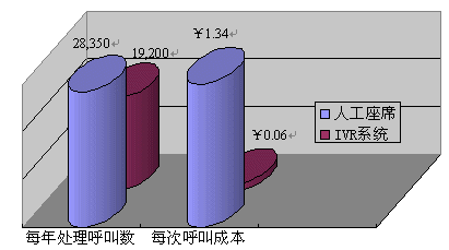 據(jù)統(tǒng)計(jì),一個(gè)72線的IVR系統(tǒng)每年能夠處理2,300,000的接入電話,平均每線IVR一年能夠處理32,000個(gè)接入電話,依照60%的有效話務(wù)處理率(即80%的接入電話可以不轉(zhuǎn)人工即可完成服務(wù))來(lái)計(jì)算,即四年期每線的投入¥4569總共可以處理76,800個(gè)電話,即便是計(jì)算上系統(tǒng)維護(hù)費(fèi)用,平均處理每個(gè)電話的成本僅為0.06元。