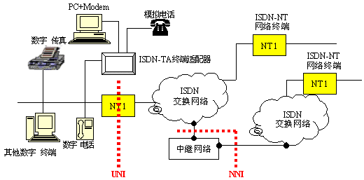 ISDN概念中的業(yè)務(wù)綜合的核心是從用戶端出發(fā),建立了一套標(biāo)準(zhǔn)的用戶和網(wǎng)絡(luò)接口協(xié)議體系(UNI:User-Network Interface)。同時給出了各ISDN網(wǎng)絡(luò)間互聯(lián)的NNI接口。這樣,非常簡單的統(tǒng)一了開發(fā)標(biāo)準(zhǔn),提供了一個廠商間開放的競爭環(huán)境。見下圖。