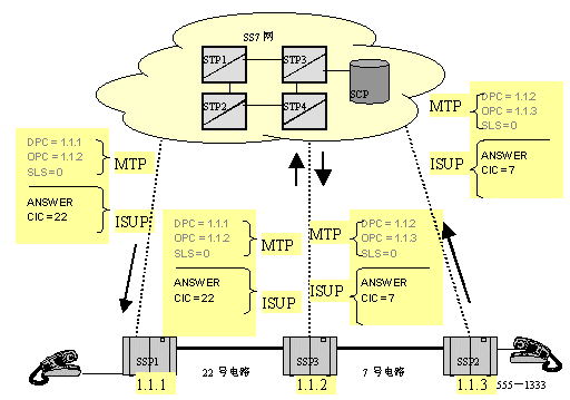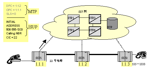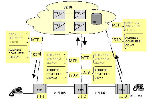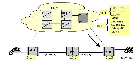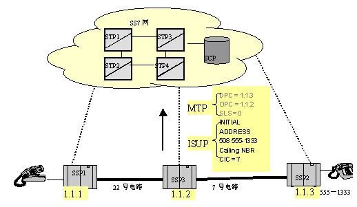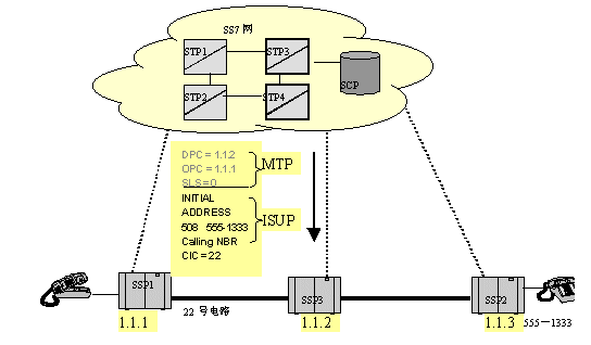 如下圖所示,當(dāng)一個用戶摘機(jī)并拔被叫號碼,交換局(SSP1)收集并分析被叫號碼,分析到被叫不是本局內(nèi)用戶,而是目的信令點(diǎn)編碼為1.1.3交換局的用戶,于是,SSP1在路由表中查找到達(dá)1.1.3的路由,然后用找到的鏈路把IAM消息發(fā)送出去,如圖中箭頭所示。