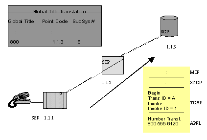 主叫用戶拔叫800用戶號(hào),這就觸發(fā)位于交換局(圖中SSP)內(nèi)的路由應(yīng)用程序發(fā)出一個(gè)TCAP查詢。圖中的STP收到查詢,用MTP層和SCCP層協(xié)議轉(zhuǎn)發(fā)查詢到SCP的800號(hào)碼數(shù)據(jù)庫。這樣,SSP中的應(yīng)用程序就和SCP直接建立了對(duì)話。