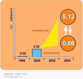 - 據(jù)CTI論壇轉(zhuǎn)引有關(guān)統(tǒng)計(jì)數(shù)字表明,全球呼叫中心外包市場(chǎng)1998年的產(chǎn)值為170億美元,2003年有望達(dá)到420億美元,并正以每年遞增27%的速度快增長(zhǎng);