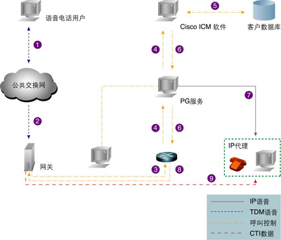 CallManager。(4)Cisco CallManager通過ICM PG把該路由申請送到ICM。(5)ICM檢查客戶的賬號信息,并通過對賬號信息的分析確定路由。(6)ICM調用一個客戶定義的路由腳本,以便選擇最合適的IPCC代理受理客戶的請求,并通過外設網(wǎng)關(PG)轉給目標CCM。(7)PG發(fā)送客戶信息數(shù)據(jù)到目標IPCC代理的桌面(在屏幕上彈出信息框)。(8)CCM指示VoIP網(wǎng)關連接客戶和目標代理。(9)VoIP網(wǎng)關建立語音連接。