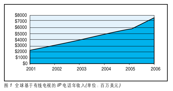 有線電視運營商在尋找使用有線電視基礎(chǔ)網(wǎng)絡(luò)HFC的新服務(wù),創(chuàng)造新的經(jīng)濟增長點,提供數(shù)據(jù)、語音、圖像綜合的服務(wù)。基于有線電視系統(tǒng)的IP電話將是第一個最有可能推出的新服務(wù)。2002年InStat/MDR的分析報告說2006年基于有線電視的IP電話網(wǎng)將達到US$75億的年收入,如圖1所示。