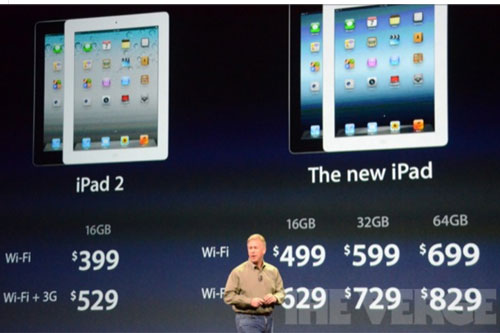 此次發(fā)布的新一代iPad分別為WiFi版16G/32G/64G,價(jià)格分別為499美元/599美元/699美元。同時(shí)蘋(píng)果新一代iPad還發(fā)布了LTE版本,同時(shí)向下支持HSPA+網(wǎng)絡(luò),其中16G/32G/64G,價(jià)格分別為629美元/729美元/829美元。