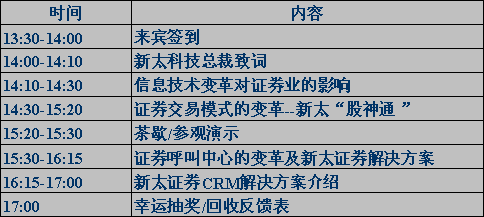與高交會同期的還有10月15日下午在投資大廈4樓多功能廳舉行的新太“股神通”產(chǎn)品發(fā)布會暨證券業(yè)務解決方案研討會(詳細情況請看邀請函)。