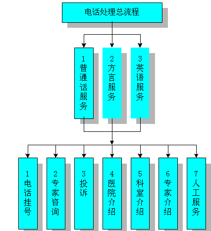 語種選擇完畢,系統(tǒng)提示用戶選擇服務(wù)類型:"請(qǐng)選擇服務(wù)種類:按1,電話掛號(hào);按2,專家咨詢;按3,投訴;按4,醫(yī)院介紹;按5,科室介紹;按6,專家介紹;按7,人工服務(wù)。"