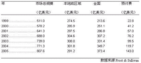 本地或區(qū)域價(jià)格方案在我們預(yù)測(cè)的時(shí)期內(nèi), 將始終是手機(jī)用戶采納的最多的一種方案。 1999年,在美國(guó)有5千7百 萬,大約70%的用戶是采用本地或區(qū)域方案, 而該方案產(chǎn)生的營(yíng)業(yè)額為274.5億美元, 約占市場(chǎng)總規(guī)模的58.6%。Frost & Sullivan 預(yù)計(jì),到2005年, 46.6%的手機(jī)用戶還會(huì)使用該種方案, 而該方案產(chǎn)生的營(yíng)業(yè)額將為291.2億美元,占市場(chǎng)總規(guī)模的比例將縮至36.1%。