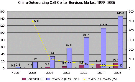 Frost & Sullivan公司研究表明在2000年,中國外包呼叫中心服務(wù)市場價值1700萬美元,共有1600坐席。本座席數(shù)是按照實際工作量來計算的,物理上存在的坐席數(shù)要超過2300個。因為許多坐席是在2000年下半年末才建成投入使用的,并且工作任務(wù)也沒有滿負荷。