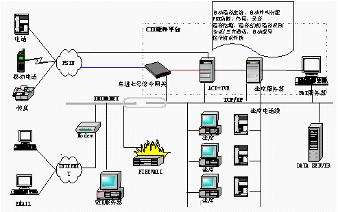 電信1000號(hào)客戶服務(wù)中心,集成了計(jì)算機(jī)網(wǎng)絡(luò)技術(shù)和計(jì)算機(jī)語音集成技術(shù)(CTI)。系統(tǒng)結(jié)構(gòu)可分為三部分:CTI硬件平臺(tái)、LAN網(wǎng)絡(luò)平臺(tái)、客戶服務(wù)軟件系統(tǒng)。東進(jìn)公司推出了基于板卡的CTI硬件方案,以七號(hào)信令網(wǎng)關(guān)進(jìn)行協(xié)議轉(zhuǎn)換。此硬件平臺(tái)具有以下優(yōu)點(diǎn):