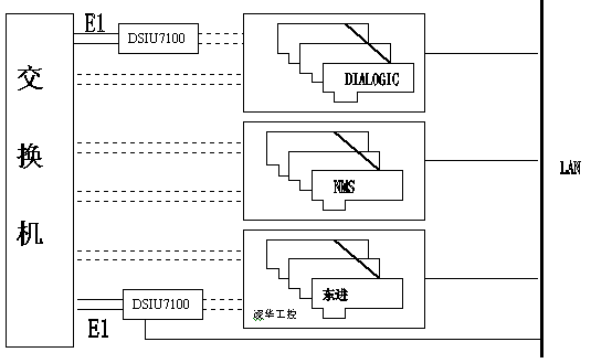 電信企業(yè)已有的112、114、170、189、180等系統(tǒng),這些系統(tǒng)的硬件設(shè)備各成體系,很可能由不同廠家的板卡組成:DIALOGIC、東進(jìn)、NMS,或其他品牌;還可能采用不同的信令方式:NO.1 信令、NO.7信令、 ISDN信令。如何把五花八門的系統(tǒng)集成起來,以有效利用、降低成本?東進(jìn)七號(hào)網(wǎng)關(guān)DSIU7100提供解決此問題的最好解決方案,系統(tǒng)可兼容不同廠家生產(chǎn)的不同數(shù)字中繼接口的語音板卡,最大限度的利用原有資源,結(jié)構(gòu)如下圖所示: