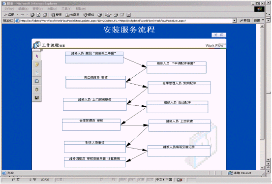 工作流程是指企業(yè)或公司的某種工作按照特定規(guī)范的流程在計(jì)算機(jī)上實(shí)現(xiàn)流轉(zhuǎn)的過程,工作流程由步驟、行為、行為處理、崗位的設(shè)置、權(quán)限設(shè)置等基本元素組成,主要對維修和回訪的流程進(jìn)行管理。