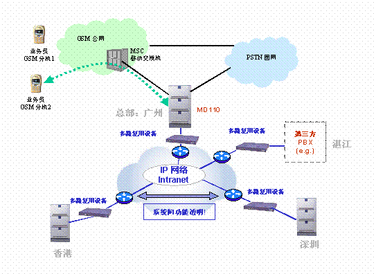 同時,在公司總部, 用愛立信MD110替換原有交換機,并與廣東移動直接相連,總部配180個設定不同的權(quán)限級別的ME(移動分機),使經(jīng)常在外辦理業(yè)務的人員的手機號被注冊為總部交換機的一個移動分機。廣東移動為所有移動分機提供特殊價格。