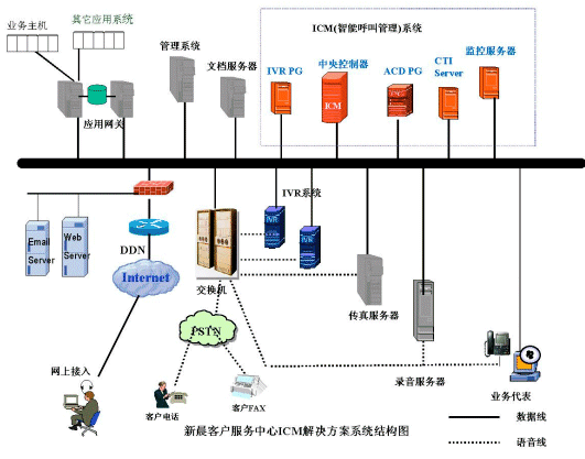 新晨客戶服務(wù)中心普及型解決方案是在以專用交換機(jī)或PC服務(wù)器加語(yǔ)音卡作為電話接入設(shè)備,如果用PC服務(wù)器加語(yǔ)音卡作為電話接入設(shè)備,將電話中繼線直接接到IVR上。此方案中的CTI系統(tǒng)能夠適用于流行的語(yǔ)音板卡和多種電話交換機(jī)的不同環(huán)境,這種解決方案主要針對(duì)小型的客戶服務(wù)中心推出。