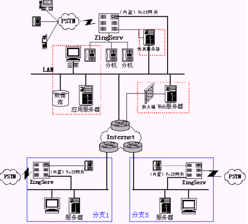 目前清華誠(chéng)志數(shù)碼公司分支機(jī)構(gòu)有5個(gè),可以通過ZingServ交換機(jī)的內(nèi)置VoIP功能在5個(gè)分支機(jī)構(gòu)實(shí)現(xiàn)組網(wǎng),從而大大節(jié)省長(zhǎng)話費(fèi)用,并實(shí)現(xiàn)內(nèi)部分機(jī)號(hào)統(tǒng)一編碼:
