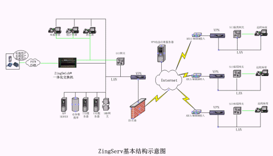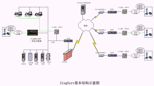 硬件:坐席集中的中心點都有ZingSwitch®交換機,S口網關和CO8卡或E1接口網關和E1卡。VPN動態(tài)注冊服務器和VPN設備,或GK服務器。
