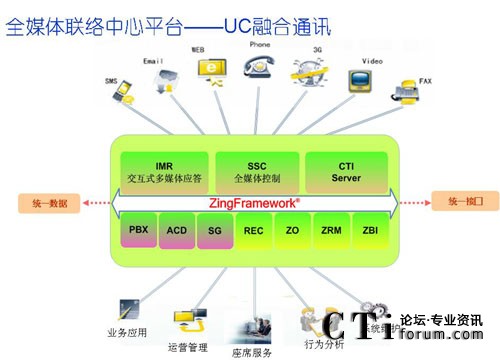 英立訊公司ZingFramework®®全媒體聯(lián)絡(luò)中心平臺(tái)基于H.323和SIP等國際標(biāo)準(zhǔn)協(xié)議,通過SOA服務(wù)架構(gòu)實(shí)現(xiàn)聯(lián)絡(luò)中心的優(yōu)化計(jì)算,為客戶應(yīng)用提供了多媒體服務(wù)處理能力,支持固話、手機(jī)、傳真、郵件、短信、互聯(lián)網(wǎng)和Web電話等多種通信方式的接入,以及3G視頻互動(dòng)和RFID物聯(lián)應(yīng)用,實(shí)現(xiàn)多種服務(wù)媒體和通訊渠道的統(tǒng)一融合,并提供統(tǒng)一接入、統(tǒng)一路由、統(tǒng)一排隊(duì)、統(tǒng)一服務(wù)、統(tǒng)一處理和回復(fù)的的綜合融合通訊服務(wù)平臺(tái)。