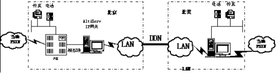 3、系統(tǒng)結(jié)構(gòu):北京新浪在Nortel交換機(jī)與AltiServ網(wǎng)關(guān)之間采用模擬線連接,AltiServ通過網(wǎng)卡接入LAN后,再通過數(shù)層路由器接入北京與北美的DDN專線。