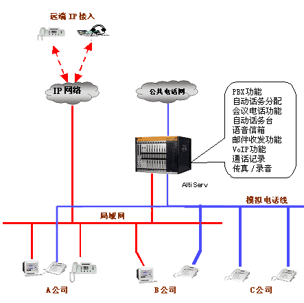 | 多個小型辦公室共享一個電話系統(tǒng)或局域網(wǎng)是一個比較經(jīng)濟選擇,現(xiàn)在很多辦公樓也是采用這種方式為大樓里的辦公室提供通訊或數(shù)據(jù)服務,大大減少了租戶的通訊的投資。但是采用傳統(tǒng)的交換機也帶來很多不便。如只能有一個總機,撥入的電話不知道是找哪個公司的,既增加接線員的工作,又不利樹立公司的形象。如何公平地向共用交換機的辦公室的收取電話費也是個解決不了的問題,因為無法記錄和統(tǒng)計每個辦公室的撥出的電話量。 但是采用奧迪堅的ALTISERV,這些問題很自然地就解決了。將每個辦公室設成一個工作組,每個工作組可以設置特定的撥入撥出電話市話號碼,對總機而言,來電時的桌面顯示公司名,或者通過多個自動話務臺直接轉入工作組。 對于撥出電話,只能通過事先設定電話進入市話網(wǎng)。這樣,這個電話的全部費用都由這個公司。 此外,共享的辦公室及其員工都可以使用ALTISERV提供的全部功能,就好象這個辦公室建了一個專門的網(wǎng)絡電話系統(tǒng)一樣。 接線圖如下: |