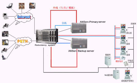 奧迪堅通訊系統(tǒng)有限公司作為CTI通訊平臺的提供商,在技術(shù)上不斷創(chuàng)新,對產(chǎn)品精益求精,尤其體現(xiàn)在對系統(tǒng)的運(yùn)行安全性的要求上,為了防止電信接入設(shè)備或者企業(yè)網(wǎng)絡(luò)出現(xiàn)故障而造成的呼叫中心服務(wù)中斷,奧迪堅呼叫中心系統(tǒng)提供安全保護(hù)冗余切換系統(tǒng),來保障呼叫中心在意外情況下的正常工作,該安全冗余切換系統(tǒng)通過對電源、T1/E1、模擬trunk、分機(jī)座席、以及各種網(wǎng)絡(luò)鏈路串口等備份切換來實(shí)現(xiàn)可靠的運(yùn)行。除此之外,奧迪堅系統(tǒng)本身也提供強(qiáng)大的安全保障,由于采用先進(jìn)IP內(nèi)核一體化設(shè)計,集傳統(tǒng)PBX、CTI服務(wù)器、IVR、ACD、Recording、FAX等眾多設(shè)備于一體,這樣有效的避免了因?yàn)橥鈷煸O(shè)備過多以及設(shè)備供應(yīng)商的不同而存在的兼容性的問題,從而降低了給呼叫中心系統(tǒng)帶來的的不穩(wěn)定的安全隱患。在系統(tǒng)之外依靠安全保護(hù)冗余切換系統(tǒng),可以實(shí)現(xiàn)外線、分機(jī)、以及各種鏈路接口的雙倍安全運(yùn)行。如上圖所示:兩臺奧迪堅的呼叫中心服務(wù)器和奧迪堅安全冗余切換系統(tǒng)構(gòu)成呼叫中心熱備份系統(tǒng),在兩臺服務(wù)器中安裝所有的呼叫中心功能模塊。通常情況下由主呼叫中心服務(wù)器提供系統(tǒng)的正常運(yùn)行,備份服務(wù)器通過安全保護(hù)冗余切換系統(tǒng)的服務(wù)監(jiān)測模塊來監(jiān)測主服務(wù)器的各項設(shè)備和鏈路的使用情況,當(dāng)主服務(wù)器遭遇突發(fā)故障不能繼續(xù)工作時,系統(tǒng)馬上實(shí)施自動切換,就會通過安全保護(hù)冗余切換系統(tǒng)將系統(tǒng)切換到備份的呼叫中心系統(tǒng)上來,此鏈路可以是數(shù)據(jù)、語音、網(wǎng)絡(luò)、串口等。當(dāng)安全保護(hù)冗余切換系統(tǒng)自身出現(xiàn)斷電或者其他故障時,所有鏈路均保持正常工作狀態(tài)。