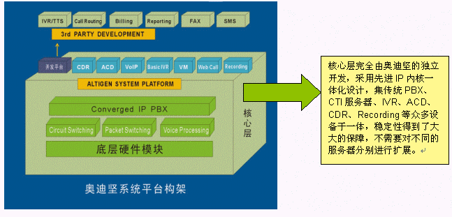 交換功能作為整個系統(tǒng)的核心功能,是系統(tǒng)一切功能的基礎(chǔ)。奧迪堅高度一體化通訊服務(wù)器AltiServ,采用先進(jìn)的DSP等技術(shù),將傳統(tǒng)的語音交換和IP包交換在系統(tǒng)底層實現(xiàn),使系統(tǒng)的技術(shù)水平、功能及穩(wěn)定性達(dá)到了一個新的高度,可以實現(xiàn)大容量電話的呼入/呼出處理、電話轉(zhuǎn)接、支持PRI、E1、中國一號信令、七號信令、模擬線路等多種接入方式,同時還具備傳統(tǒng)PBX所不具備的強(qiáng)大的語音信箱、電話會議功能、VoIP、界面友好的系統(tǒng)管理功能等。由于在底層對VoIP支持,所以既可以使用普通電話機(jī),也可以使用IP話機(jī)或者軟電話登陸到系統(tǒng),豐富了用戶的選擇的范圍,方便了用戶使用并節(jié)省投資,并且VoIP技術(shù)擴(kuò)展了增值空間,可以用IP座席輕松構(gòu)建遠(yuǎn)程專家座席,更加適合互聯(lián)網(wǎng)時代的應(yīng)用。