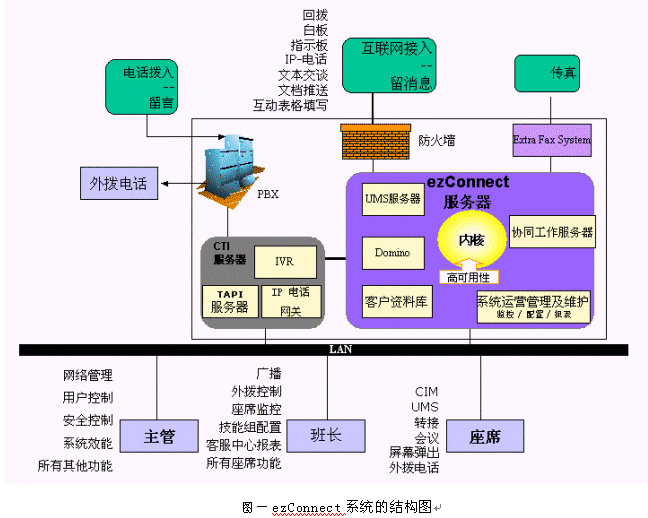 ezConnect系統(tǒng)是由訊泰信息科技公司的北京研發(fā)中心設(shè)計開發(fā)出來的一個成熟的多媒體呼叫中心產(chǎn)品。支持傳統(tǒng)電話、web、電子郵件、傳真、語音郵件、IP電話、短消息、WAP等用戶接入方式;對客戶請求采用基于座席技能的智能分派;提供文本交談、白板共享、協(xié)同填表、文檔推送、IP電話、短消息發(fā)送等多種實時交流工具;有非常實用的實時監(jiān)控和報表子系統(tǒng)。核心部分的設(shè)計采用分離分層的思想,實現(xiàn)了相對于PBX、IVR、CRM的透明性。系統(tǒng)的配置非常靈活,可以在很短的時間內(nèi)完全改變整個客戶端的風(fēng)格,或支持一種新的語言。整個系統(tǒng)建立在Java平臺上,具有良好的可移植性。下面是ezConnect系統(tǒng)的結(jié)構(gòu)圖: