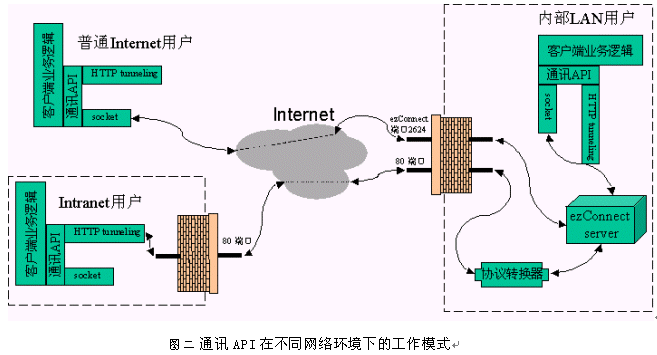 對于被企業(yè)防火墻所限制的Intranet用戶,情況略微復(fù)雜一些。如果企業(yè)防火墻已開放ezConnect的協(xié)議端口2624,那么此類Intranet用戶訪問ezConnect系統(tǒng)的情況與普通Internet用戶沒有區(qū)別。如果企業(yè)防火墻限制ezConnect的協(xié)議端口,但允許HTTP協(xié)議通過,那么上文中提到的API會自動選用HTTP隧道的通信方式來維護客戶端軟件與服務(wù)器軟件之間的連接。此時,通信的效率會相對低一些,但對于可以透明地、完整地獲取Internet呼叫中心服務(wù)(文本交談、白板共享、IP電話等)的Intranet用戶來講是完全可以接受的。如果企業(yè)防火墻同時禁止ezConnect的協(xié)議端口2624和HTTP協(xié)議的默認(rèn)端口80,Intranet用戶將無法訪問ezConnect系統(tǒng)。而事實上,嚴(yán)格到不允許HTTP協(xié)議通過的防火墻是非常少見的,因此目標(biāo)4也不成為問題。