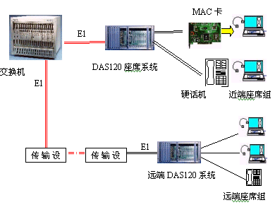 見下圖:DAS120主機(jī)通過(guò)4個(gè)E1接口與交換機(jī)直接連接,可方便地實(shí)現(xiàn)本地座席接入。遠(yuǎn)端分布式接入則需要通過(guò)傳輸設(shè)備,它們可為光纖,微波,HDSL等。終端可為座席卡和電話機(jī)。