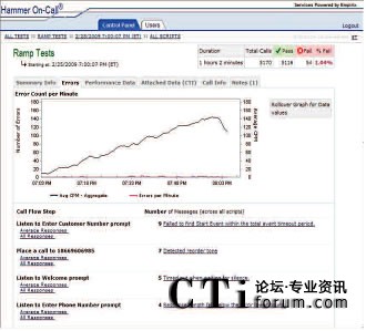 Hammer On-Call IVR測試使用各種各樣的主叫場景模擬真實世界用戶交互。通過改變呼叫量和呼叫場景的混合,Empirix測試專家可以生成指向IVR的模擬真實世界的呼叫流量。此外,在測試中,不同的呼叫測試點上可以使用不同的呼叫率。在測試過程中經常會用到三種基本呼叫模型及其變體;緶y試是使用一個恒定的低呼叫率檢驗被測環(huán)境是否已準備好接受呼叫;增量測試是使用一個固定增量穩(wěn)步增加呼叫量一直到達峰值呼叫量,然后,增加呼叫量直至超過期望值,檢驗系統(tǒng)在峰值時段內是否有額外容量;最后,‘浸透’測試是在指定的時段內使用一個恒定的高呼叫率檢驗系統(tǒng)穩(wěn)定性。