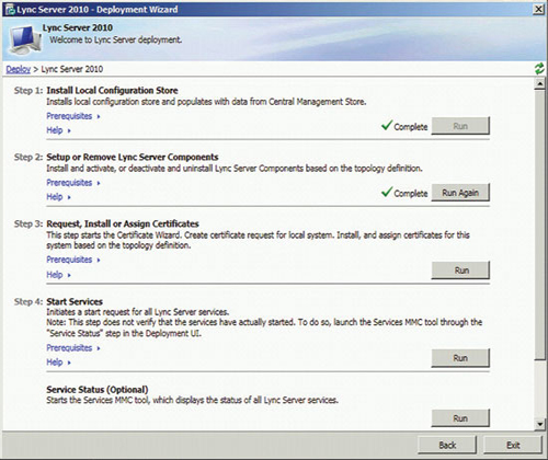 準(zhǔn)備好基礎(chǔ)結(jié)構(gòu)并發(fā)布拓?fù)浜,即可開始安裝前端服務(wù)器和服務(wù)器角色,以啟用 A/V 會議、企業(yè)語音、監(jiān)控、存檔及其他功能。準(zhǔn)備每臺服務(wù)器從運行部署向?qū)В▍⒁妶D 3)開始,但每個服務(wù)器角色都有自己的安裝和配置要求。您可以在 TechNet 庫的“部署 Lync Server 2010 Standard Edition”部分查找更多詳細信息。