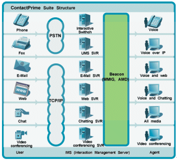 ContactPrime Beacon是ContactPrime系列產品中的一個組件,它是核心組成元件,可為CSR處理和提交各種多媒體,包括電話、傳真、電子郵件、VoIP、FoIP、語音郵件、Web交互、聊天、視頻會議及Web協作等。