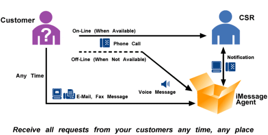 iMessage Agent可與您已有的ACD系統(tǒng)集成,當(dāng)目標(biāo)CSR不在時(shí)電話系統(tǒng)就將呼叫交付給iMessage Agent,iMessage Agent接到呼叫之后將對呼叫方進(jìn)行合適的問候,再將消息存儲在郵件服務(wù)器中。根據(jù)預(yù)定義的規(guī)則,消息會被隨后路由到正確的消息框中。