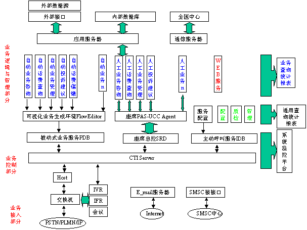 平臺部分完成系統(tǒng)的基本服務(wù)處理,不針對具體的服務(wù)業(yè)務(wù),提供電話接入、呼叫控制、人工/自動(dòng)服務(wù)、e_mail服務(wù)、WEB服務(wù)、SMSC服務(wù)等的基礎(chǔ)環(huán)境。業(yè)務(wù)部分完成系統(tǒng)的業(yè)務(wù)描述,按照平臺的業(yè)務(wù)接口,針對聯(lián)通1001客戶服務(wù)的每一個(gè)具體業(yè)務(wù)需要,開發(fā)相應(yīng)的服務(wù)業(yè)務(wù)功能模塊或流程,實(shí)現(xiàn)系統(tǒng)的服務(wù)業(yè)務(wù)。業(yè)務(wù)部分完全建立在PAS-UCC平臺之上。
