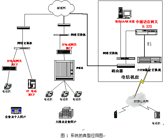 系統(tǒng)的真正價值應該在實際應用中得以體現(xiàn)。這套系統(tǒng)的很重要的一個應用領(lǐng)域就是VoIP接入網(wǎng)的建設(shè)。其典型的應用如圖1所示。