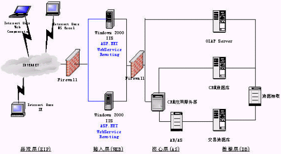 展現(xiàn)層實(shí)現(xiàn)定制化的、支持各種接入設(shè)備的統(tǒng)一消息平臺(tái)是非常必要的,它必將極大地促進(jìn)公司服務(wù)產(chǎn)品的發(fā)展。在展現(xiàn)層我們還強(qiáng)調(diào)企業(yè)信息門(mén)戶的建立:信息不是孤立的,需要一個(gè)統(tǒng)一的、互動(dòng)的、個(gè)性化的、全面的綜合表現(xiàn)形式,以更方便公司人員對(duì)信息的獲取,作出正確的決策。使用ASP.Net和OfficeXP Web Components OLAP展示工具,并能有機(jī)的與辦公自動(dòng)化工具結(jié)合起來(lái)。