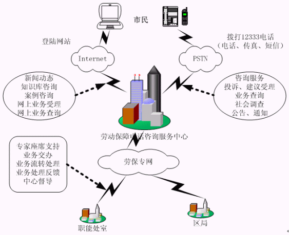 合肥市12333電話咨詢服務(wù)系統(tǒng)的建設(shè),使勞動和社會保障業(yè)務(wù)延伸到市民、企業(yè)的身邊?朔赜蚝蜁r間的限制,實現(xiàn)了每天24小時不間斷地隨時提供服務(wù)。該系統(tǒng)的建設(shè)將原本分散在各部門的對外服務(wù)業(yè)務(wù)內(nèi)容,集中在一個統(tǒng)一的對外服務(wù)"窗口",并與就業(yè)、失業(yè)、養(yǎng)老、醫(yī)療、生育及勞動關(guān)系等管理系統(tǒng)建立接口,實現(xiàn)資源共享,為勞動者提供包括電話、傳真、電子郵件、因特網(wǎng)等多種方式熱線咨詢服務(wù),從而架起勞動者與勞動部門之間密切聯(lián)系的橋梁,使廣大勞動群眾的權(quán)益真正落到了實處。樹立勞動和社會保障行業(yè)系統(tǒng)的良好服務(wù)形象。推動勞動保障局管理和服務(wù)的社會化,實行全面的標(biāo)準(zhǔn)化、規(guī)范化、制度化和網(wǎng)絡(luò)化的完善的服務(wù)。