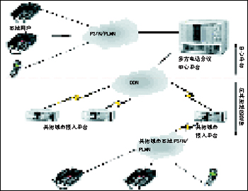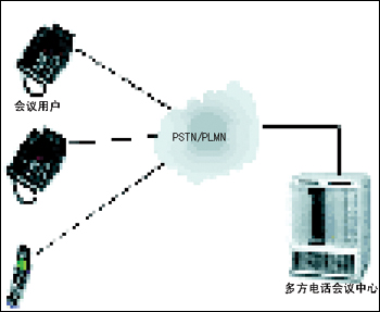 目前,根據(jù)建設(shè)思路中所提到的分期實施原則,第一期只完成本地多方電話會議中心平臺的建設(shè)。參加電話會議的各方用戶均直接通過公眾電話網(wǎng)撥入中心平臺,由中心平臺統(tǒng)一接入并組織會議資源為用戶服務(wù),結(jié)構(gòu)如圖2所示。