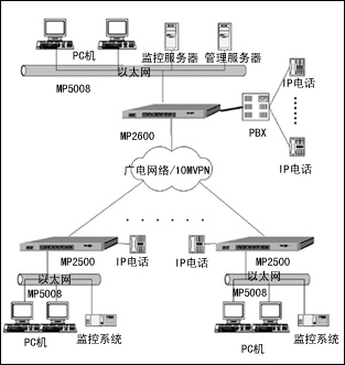 在實(shí)際搭建中,總店采用一臺MP2600路由器,配雙以太口,一個口接MP5008交換機(jī)組建本地以太網(wǎng),一個口接廣電的10M VPN,以實(shí)現(xiàn)本地以太網(wǎng)與各分店、配送中心等連接。配2個RM2-2VOS四路IP電話接交換機(jī)模塊,與PBX程控交換機(jī)相連,以實(shí)現(xiàn)全網(wǎng)IP電話免費(fèi),以及網(wǎng)內(nèi)電話與市話的連接?偟暌蕴W(wǎng)中,掛有管理服務(wù)器、監(jiān)控服務(wù)器、辦公自動化服務(wù)器以及各部門的PC機(jī)等。