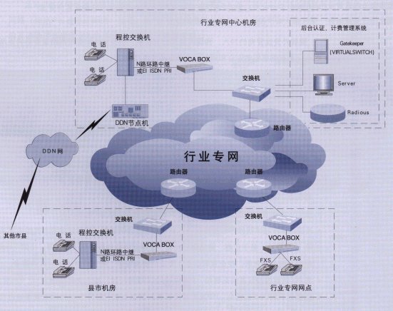 中心并設(shè)立一級計費認證及結(jié)算中心、網(wǎng)絡(luò)管理中心(VBMS),對網(wǎng)內(nèi)電話集中管理和計費。通過在各地市機構(gòu)原有的內(nèi)部網(wǎng)絡(luò)基礎(chǔ)上增加數(shù)臺VOCABOX實現(xiàn)語音終端接入,并在地市機構(gòu)通過帶FXO接口的VOCABOX實現(xiàn)內(nèi)部IP電話與內(nèi)部電話網(wǎng)絡(luò)的呼叫轉(zhuǎn)接,網(wǎng)絡(luò)拓撲連接如下圖所示