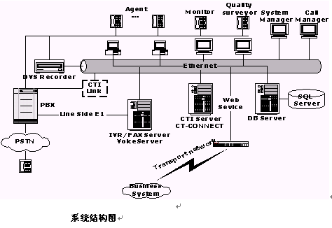 交換機(jī)實現(xiàn)電話呼入、呼出功能;還需要提供自動排隊機(jī)系統(tǒng),用于實現(xiàn)對來話的均衡分配;呼叫管理系統(tǒng),用于有效管理所有話務(wù);支持IVR;提供CTI Link模塊作為計算機(jī)/電話集成接口;同時,交換機(jī)還可作為辦公電話交換機(jī)使用,系統(tǒng)可支持多家公司的交換機(jī)。