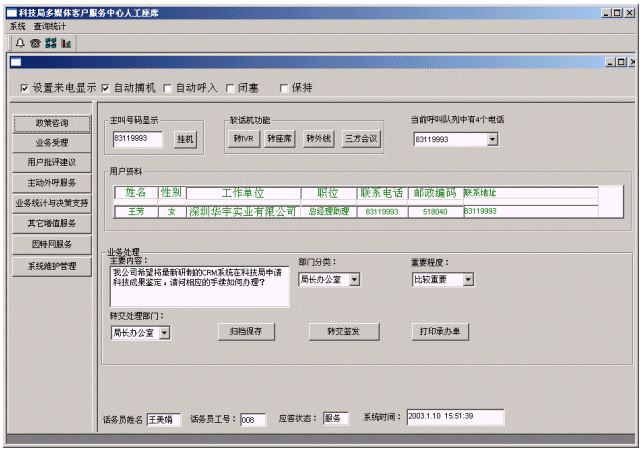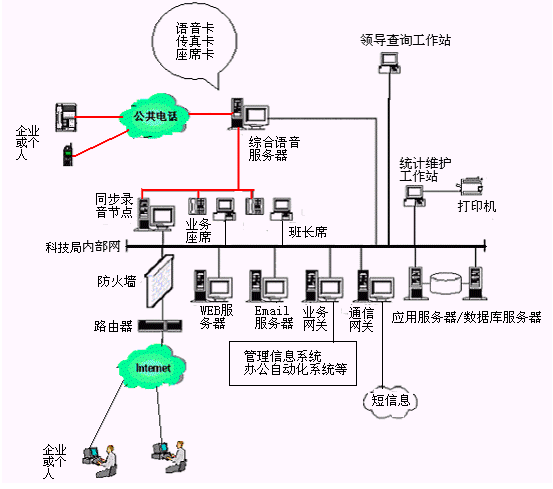應(yīng)用現(xiàn)代先進(jìn)的CTI技術(shù)建立的科技局公開電話系統(tǒng),改變了傳統(tǒng)的科技局辦公的一部電話、一支筆、一個(gè)本(或用計(jì)算機(jī)當(dāng)打字機(jī))的記錄、交流模式。在充分利用各級(jí)科技局現(xiàn)有辦公自動(dòng)化系統(tǒng)基礎(chǔ)上,通過(guò)共享科技局、社會(huì)網(wǎng)絡(luò)資源,能夠?yàn)槠髽I(yè)或個(gè)人提供了更多、更好、更便捷的服務(wù)。