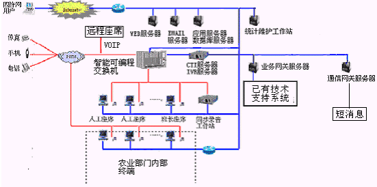 客戶利用電話、傳真、手機(jī)等撥打統(tǒng)一的特服號碼(如800XXX或9XXXX)或因特網(wǎng)進(jìn)入農(nóng)業(yè)分布式呼叫中心,本系統(tǒng)依托農(nóng)業(yè)部門各類計算機(jī)業(yè)務(wù)技術(shù)支持系統(tǒng)和網(wǎng)絡(luò)系統(tǒng),實現(xiàn)與農(nóng)業(yè)部門原有管理系統(tǒng)/業(yè)務(wù)系統(tǒng)及數(shù)據(jù)庫的無縫連接,通過人工受理或自動語音服務(wù)等方式全天24小時不間斷地為客戶提供各種服務(wù)。