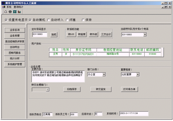 客戶打入電話后,當(dāng)系統(tǒng)的自動語音應(yīng)答子系統(tǒng)無法解決客戶問題時,客戶可選擇人工服務(wù),由客戶服務(wù)代表直接接聽客戶電話,處理并解決客戶問題。此時客戶同座席話務(wù)人員直接溝通,并同時記錄下該客戶的聯(lián)系方式,將相關(guān)數(shù)據(jù)添加入系統(tǒng)數(shù)據(jù)庫;也可以在數(shù)據(jù)庫的支持下處理傳真業(yè)務(wù),電子郵件,計算機(jī)文件傳輸、滿意度調(diào)查等。