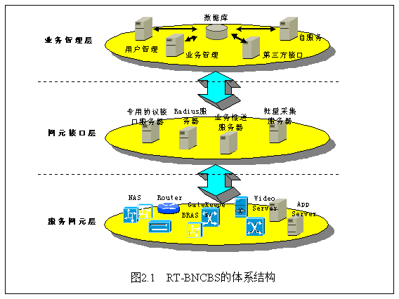 RT-BNCBS管理計費(fèi)平臺從邏輯上分為三層:服務(wù)網(wǎng)元層、網(wǎng)元接口層和業(yè)務(wù)管理層。如圖1所示。