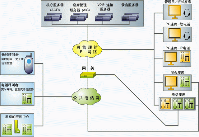 完全克服了傳統(tǒng)的客服中心對(duì)座席地理位置的約束,可以在多個(gè)地點(diǎn)設(shè)有座席和與電信公網(wǎng)的接入點(diǎn),座席分布在多個(gè)地點(diǎn)獨(dú)立運(yùn)營(yíng),但由一個(gè)中心點(diǎn)來(lái)控制和管理。