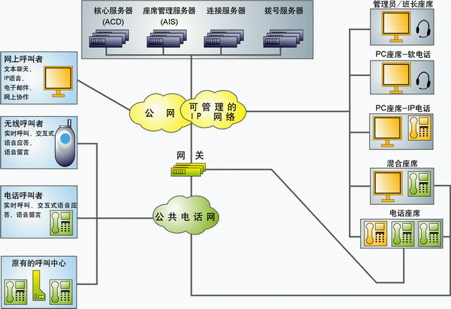 | 支持多種呼入方式 | 普通電話呼入、消息(e-mail、語(yǔ)音留言、傳真)呼入、Internet呼入。 | ![]() |