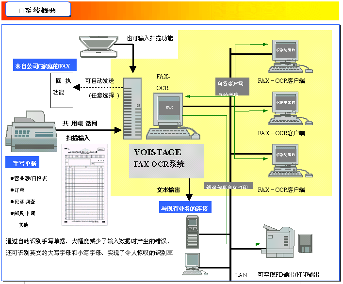 能夠大范圍地建立起從簡(jiǎn)便的的熨臺(tái)型4條回線系統(tǒng)到最大320條回線客戶端?服務(wù)器的大規(guī)模網(wǎng)絡(luò)。采用高性能的OCR引擎即使是不標(biāo)準(zhǔn)的手寫文字也能正確識(shí)別。 依靠學(xué)習(xí)功能和辭典的知識(shí)處理, 越加使用越能提高識(shí)別率。