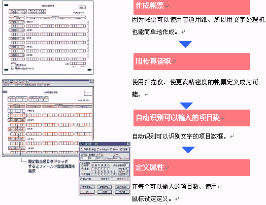 ·輸入單據(jù)的定義自如對(duì)于制作OCR帳票及能夠輸入項(xiàng)目數(shù)的設(shè)定、不需要專業(yè)知識(shí)和經(jīng)驗(yàn)。使用鼠標(biāo)的對(duì)話形式、能簡(jiǎn)單地完成準(zhǔn)備。