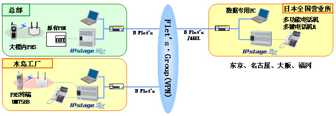 SX”通過SIP協(xié)作的IP電話系統(tǒng)。系統(tǒng)中所采用的“IPstage MX/SX”通過NTT西日本的VPN服務“Flet's・Group”相互連接,實現(xiàn)高音質(zhì)的內(nèi)線環(huán)境。使用內(nèi)線電話號碼進行事業(yè)所之間的通話聯(lián)系,可以直接與想聯(lián)系的對象通話,無需傳叫電話。進而,由于工廠采用了沖電氣所制造的PHS終端“UM7588”,可以在工廠任何地方實現(xiàn)直接電話聯(lián)系。導入該系統(tǒng)后,即使業(yè)務場所分處幾地,也能成功實現(xiàn)員工間的迅速溝通。