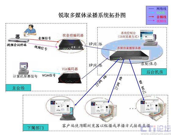 如上圖所示,硬件系統(tǒng)采用了前后臺分離的模式,前端的視音頻編碼器將從終端上采集的視音頻信號與VGA編碼器采集的VGA信號進行編碼,通過內(nèi)部專屬網(wǎng)絡(luò)傳輸?shù)胶笈_機房的錄播服務(wù)器中,通過服務(wù)器內(nèi)部功能模塊,不僅將整個會議或者培訓(xùn)現(xiàn)場的視音頻與電腦桌面內(nèi)容同步錄制保存在專屬硬盤中,同時將上述采集內(nèi)容實時轉(zhuǎn)發(fā)直播到用戶局域網(wǎng)中。通過錄播系統(tǒng)的身份驗證機制,通過連接到網(wǎng)絡(luò)中的任意一臺PC即可接收直播的內(nèi)容。同時錄制保存在專屬硬盤上的內(nèi)容還可以后期點播回訪(需身份驗證)。